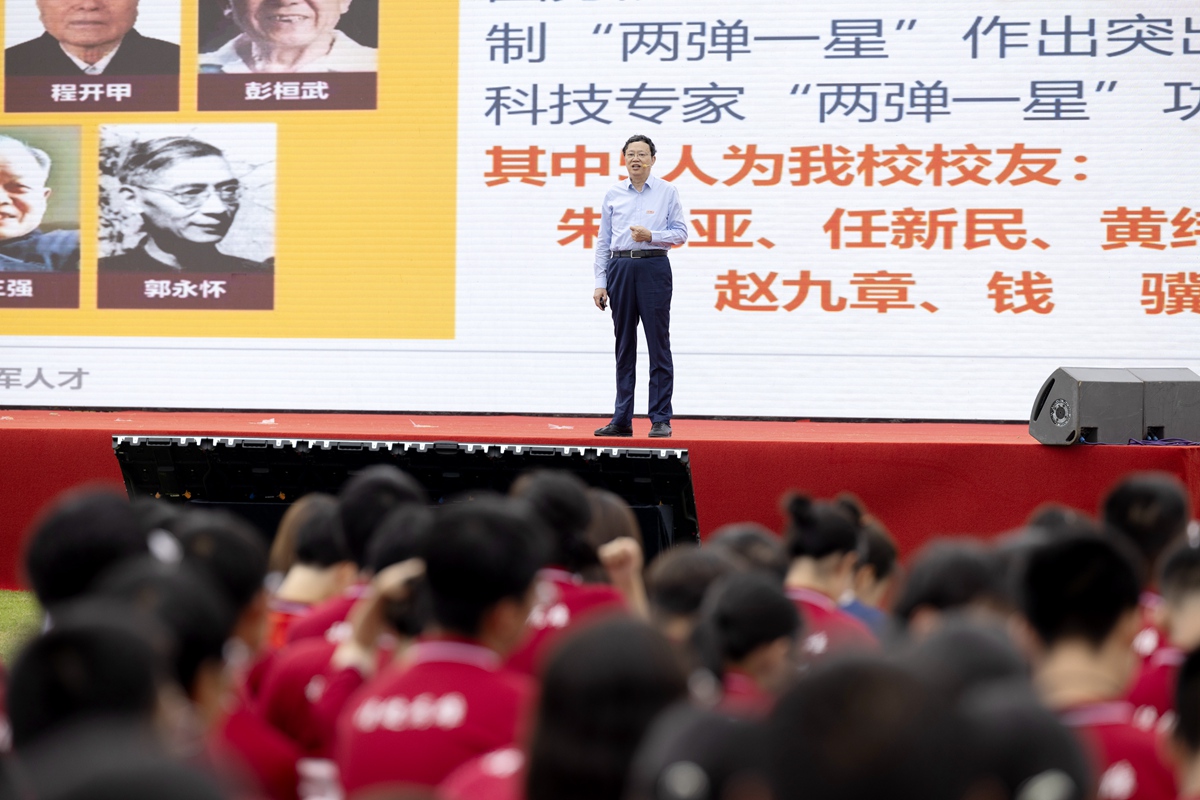 “承传统,继承弘扬东大人的家国使命,就是要了解东南大学从哪里来、到哪里去,了解东南大学在120多年的办学历程中,人才报国、科学名世、艰苦奋斗等优良传统的一脉相承……”左惟从张之洞先生创建三江师范学堂谈起,强调东南大学是一所为使命而诞生的学校,建校以来始终坚持以育人为己任,以强国为目标,培养了一大批建功立业的精英翘楚,在各个不同办学时期,涌现了一大批以天下为己任,担当奉献、至诚报国的东大师生。左惟通过回顾中国科学社设在“南高”,在东南大学诞生了一批现代学科,东南大学为我国教育和科技发展开创了许多个第一,近年来学校聚焦“四个面向”、承担国家科研项目实现量质齐升等,介绍了东南大学以科学名世,精进科技、服务国家、造福社会的有关情况。接着,左惟通过讲述两江师范学堂时“嚼得菜根,做得大事”的校训和“西迁”办学时物质上的窘迫并没有妨碍学生求学报国等故事,带领新生们感悟学校艰苦奋斗的优良传统。他指出,回顾东南大学自诞生起教育救国、教育兴国、教育强国的发展历程,家国担当是东南大学永恒的价值追求。在服务国家的过程中,东南大学也得到党和国家的关注,左惟传达了习近平总书记考察调研依托学校共建的紫金山实验室时的重要讲话精神,鼓励新生们要牢记殷切嘱托、勇担强国使命,把握机遇、再立新功!