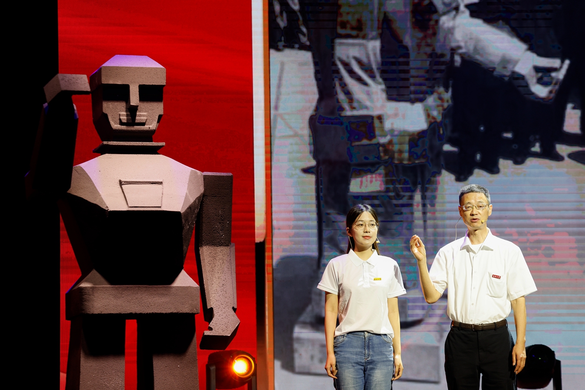 第二篇章“为国筑基 伟业脊梁”通过现场与视频相结合的方式,向师生们动情讲述了一代代东大人如何垒石成峰、接续奋斗,用智慧和汗水铸就兴国伟业的坚实脊梁。现场以《将这血肉“补”在导弹上》《于无声处作波涛》《机器人的启航与教育之光》《做脊梁的支撑者》为题,讲述了从“两弹一星”功勋奖章获得者、中国科学院院士、东南大学校友黄纬禄,到中国工程院院士、核动力专家、东南大学校友于俊崇;从新中国第一台人形机器人研制者查礼冠教授的先驱探索,到黄惟一教授的深耕细作,再到宋爱国教授的领航创新;以及孙伟、缪昌文、刘加平三位院士接力前行,为三峡工程、港珠澳大桥等大国重器保驾护航的传承故事。