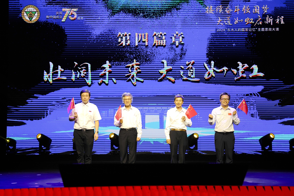 主题思政课在庄严的《中华人民共和国国歌》声中拉开帷幕。全体师生首先观看了“课程序章”——《千重山水千重歌 万里家国万里志》视频短片,回顾了新中国成立75周年以来,东大人深刻而感人的国家记忆。